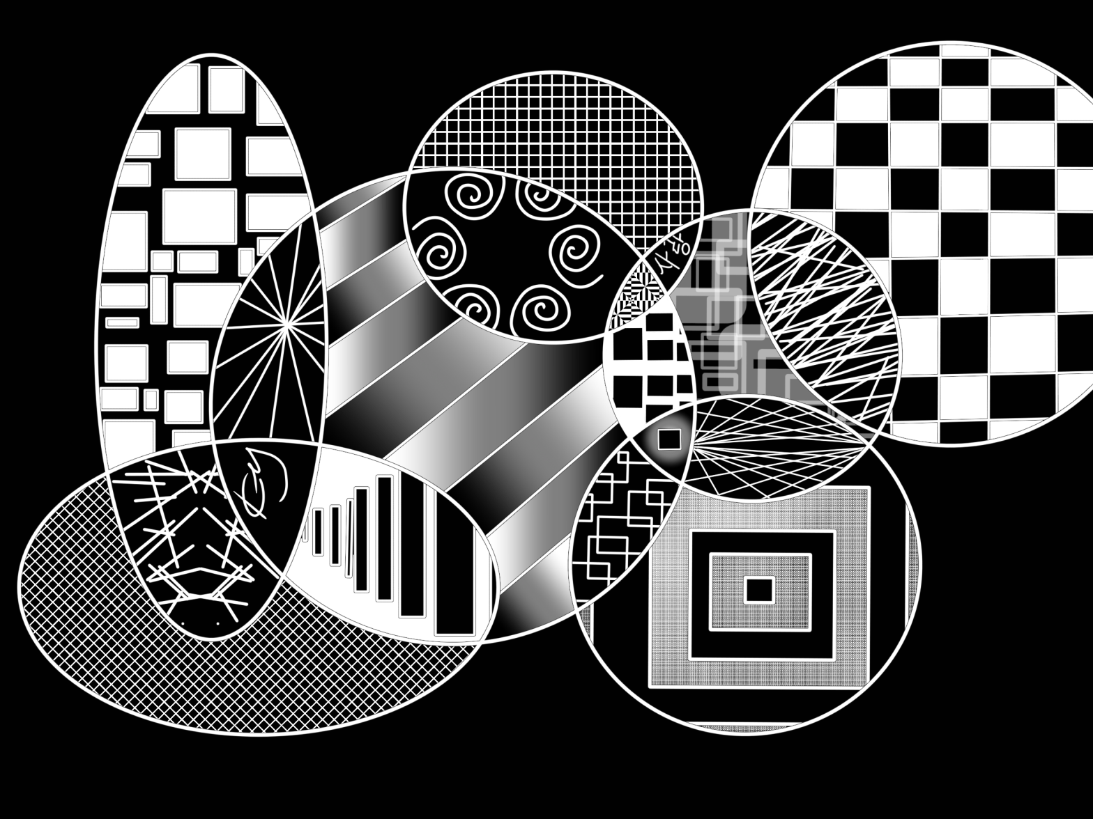 Abstract digital drawing of various patterns inscribed on an overlapping rounded scribble.